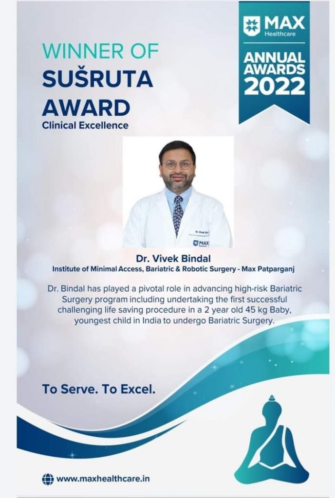 Dr. Sachin Mittal honoured with SUSRUTA Award by Max Healthcare for clinical excellence and development of a successful Bariatric program at Max Patparganj, Vaishali and Noida.