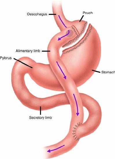 It is also an effective procedure for resolution of diabetes, sleep apnea and control of hypertension. In this, a small gastric pouch of 15-20ml is created, which leads to reduction of food intake. The intestinal architecture is then changed so that a large portion (175-250cm) of small intestine is bypassed, before the digestion and absorption of food starts. This results in malabsorption of food, and subsequent drastic weight loss. In the end, the integrity of pouch is checked using per-operative gastroscopy. A small abdominal drain is usually left which is taken out after 48-96 hours.